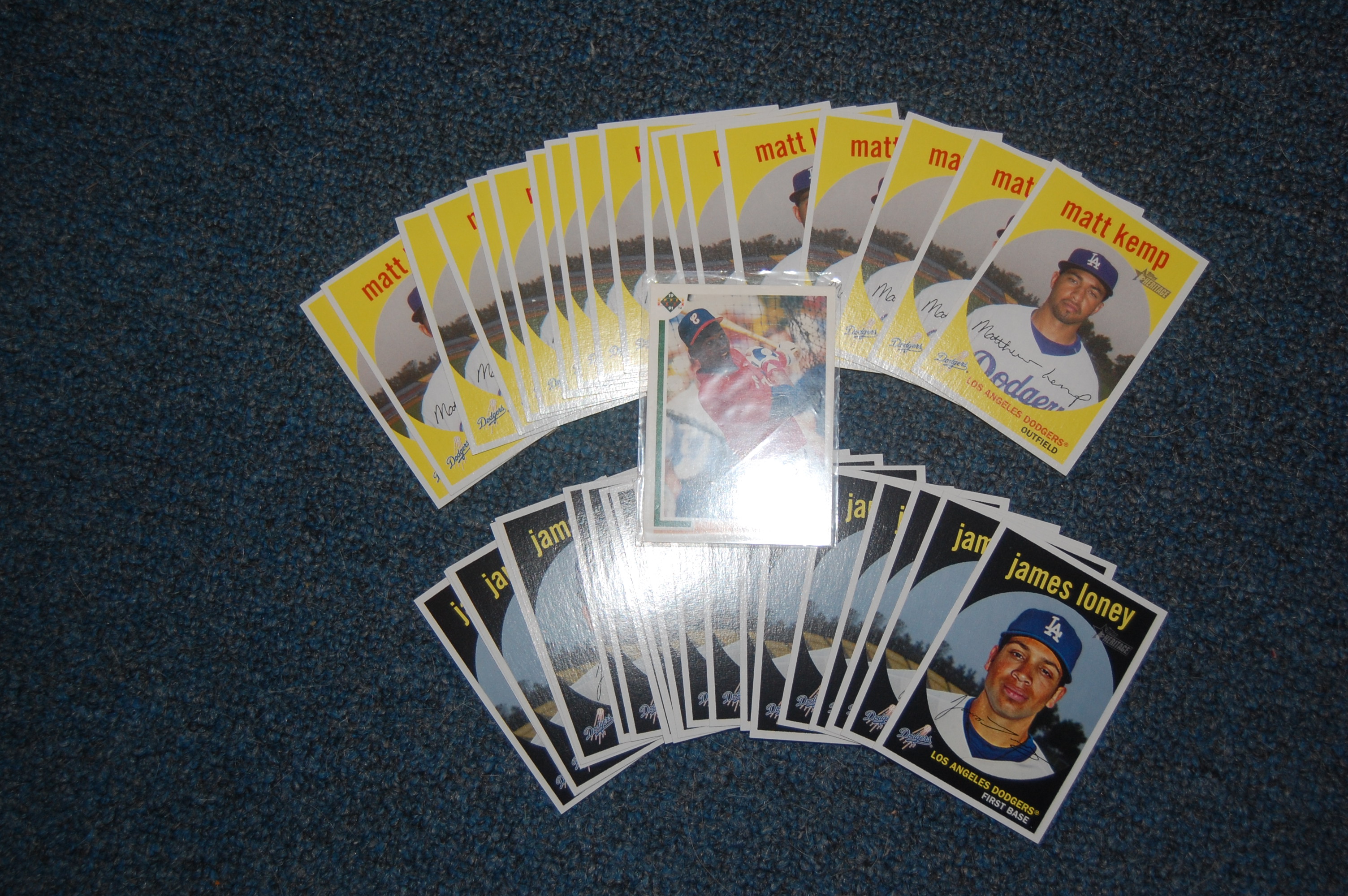 I got home and opened the two boxes. Both had 2008 Topps Heritage written on them and then some numbers like 318-348 and 267-317. As I opened the boxes I realized that the numbers represented the number on the cards in those boxes and they were organized in order. There were anywhere from 8 to 20 cards of each player. As I pulled out 18 Matt Kemp cards I realized just what this could be. My first thought went instantly to the belief that these boxes came from a baseball card shop that had gone out of business or was simply trying to do a good deed and donate extra cards, and had given 2 dozen boxes of cards to the Goodwill.