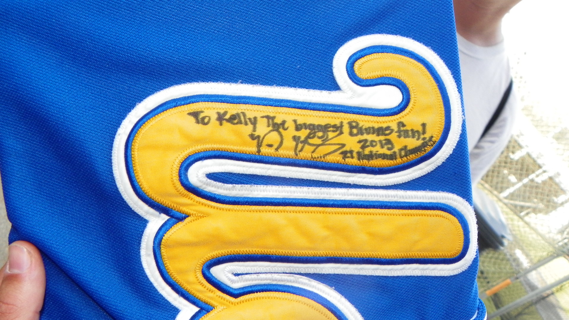 He was drafted by the Giants in the 6th round and I hoped he would be assigned to Salem and he was. I took my UCLA baseball jersey that I had down to Salem. I waited by where the players came out and when he walked out I asked him to sign my jersey and normally I don’t ask for them to sign anything specific but I did this time. He signed it “To Kelly the biggest Bruins fan Nick Vander Tuig 2013 National Champs” to say I was pumped would be an understatement.