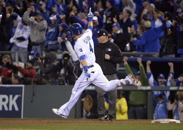 Oct 27, 2015; Kansas City, MO, USA; Kansas City Royals left fielder Alex Gordon (4) reacts after hitting a solo home run against the New York Mets in the 9th inning in game one of the 2015 World Series at Kauffman Stadium. Mandatory Credit: John Rieger-USA TODAY Sports